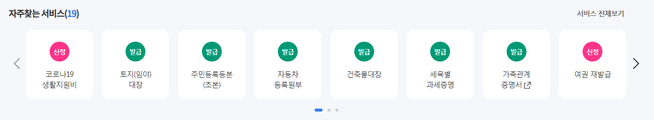중앙행정기관 공공기관 지방자치단체 서비스 9만 종을 한번에 확인할 수 있으며 민원 업무 뿐 아니라 발급까지 간편하게 할 수 있으므로 자주 접속해서 혜택을 알아보시는 것이 좋습니다.