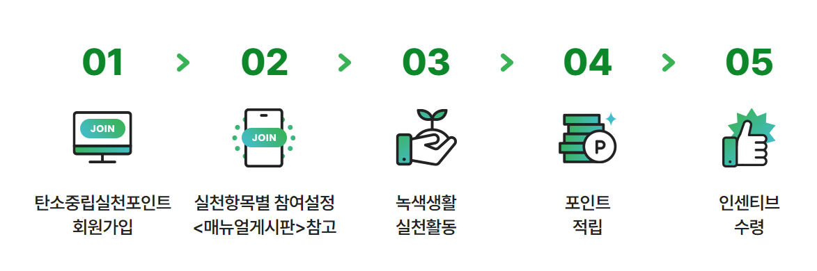 아래 탄소중립 실천포인트제 홈페이지 가입 후 실천 항목별 참여 설정을 하고 녹색 생활 실천활동을 하시면 포인트 적립 및 인센티브 수령이 가능합니다.
