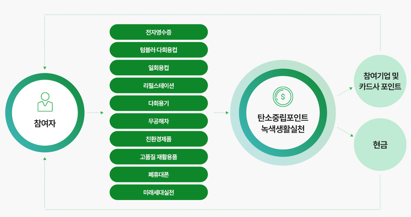 일상 생활 속에서 친환경적인 활동을 실천하는 전국민 대상이며 탄소중립 포인트 녹색 생활 실천 누리집 홈페이지 회원 가입을 통해 참여하시면 됩니다. 참여 시 1인당 최대 7만원 지원되며 현금 또는 카드사 포인트로 지원됩니다.